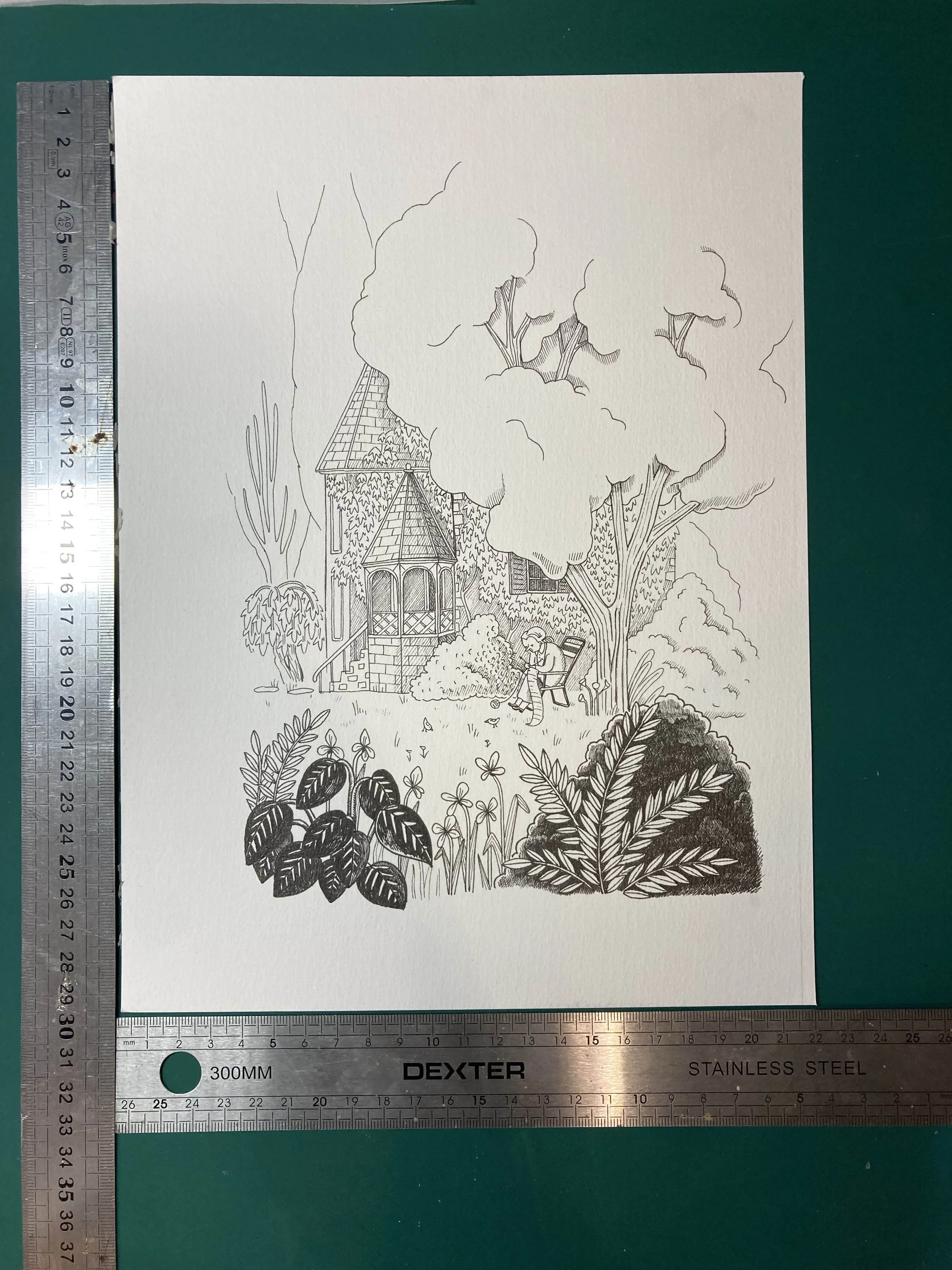 Dessins pour le livre « La Maison sous la maison » Texte d’Emilie Chazerand publié en 2024 chez Sarbacane. Les dimensions sont indiquées sur la photo.